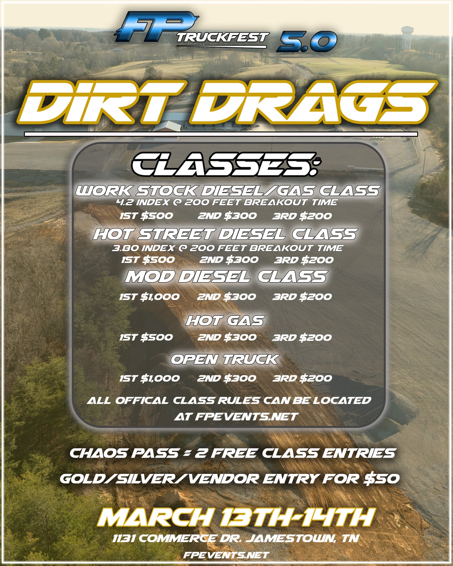 Official dirt drag class rules for competing trucks. Chaos Pass = 2 free class entries. Registered Vendor/Gold/Silver Lot trucks enter for $50 per class!